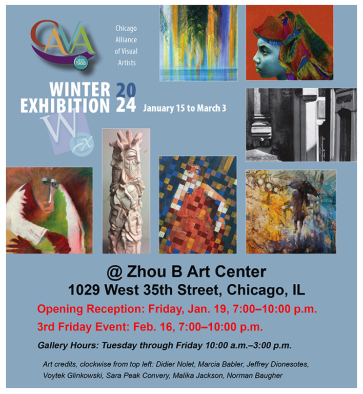 Excited to announce that my mixed media artwork “Dusting of Snow” was selected by the Chicago Alliance of Visual Artists (CAVA) for their 2024 Winter Exhibition, which opens today and runs through March 5 at the Zhou B Art Center at 1029 W 36th Street in the Bridgeport neighborhood. I will be in balmy Chicago for the opening reception this coming Friday night (1/19) from 7-10pm. Please check out the show, and if you’re in the vicinity of the Chicagoland frozen tundra on Friday night, you’re cordially invited to layer up with bearskins, hitch up the sled dogs, and come on down – I’d love to see you. The exhibition flyer with more details is below.